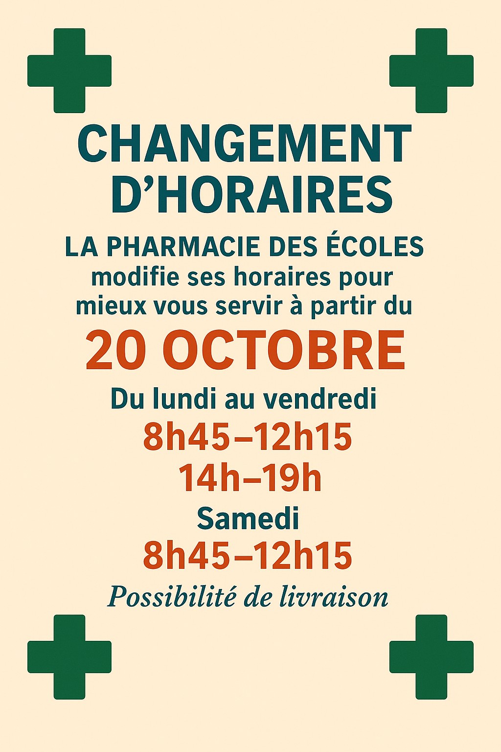 - Changement d'horaires de la PHARMACIE DES ECOLES
